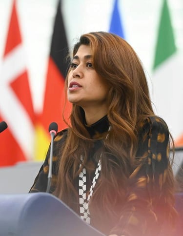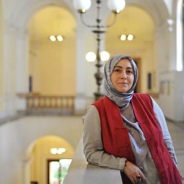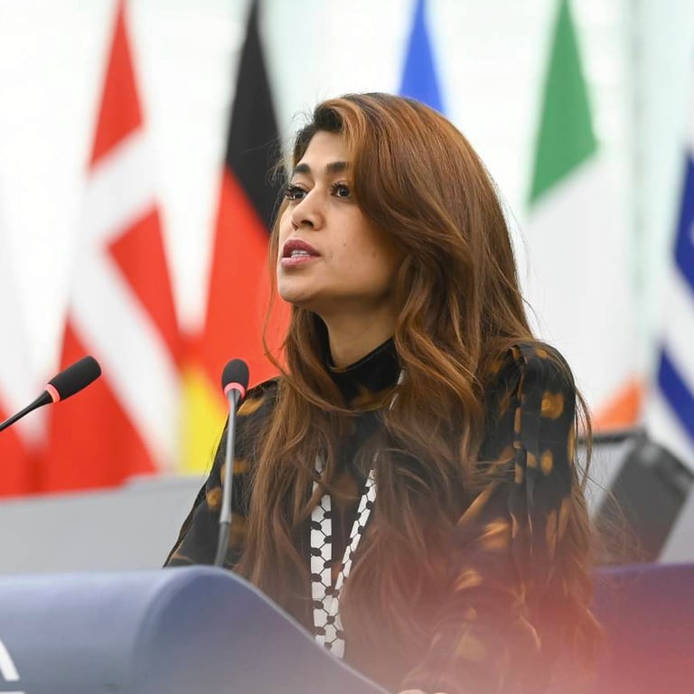 Rima Hassan, Europaabgeordnete der französischen Delegation von La France Insoumise in der Fraktion The Left. Sie wurde im Flüchtlingslager Neirab in Syrien geboren, und kam mit zehn Jahren nach Frankreich wo sie internationales Recht an der Universität Paris Panthéon-Sorbonne studiere, und zum rechtlichen Rahmen in Flüchtlingslagern promoviert. 2019 gründete sie das Observatory of Refugee Camps (OCR), eine unabhängige NGO zur Aufklärung über Verwaltung und Zustände in Flüchtlingslagern weltweit. Sie arbeitete für das französische Amt für Flüchtlingsschutz, war Berichterstatterin am Nationalen Asylgericht und Co-Direktorin bei iReMMO. Zudem war sie in Expertengremien zur Integration und zu Menschenrechten tätig. 2023 wurde sie von Forbes zu einer der „40 Women of the Year“ gewählt.