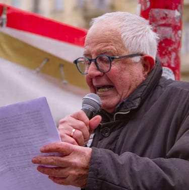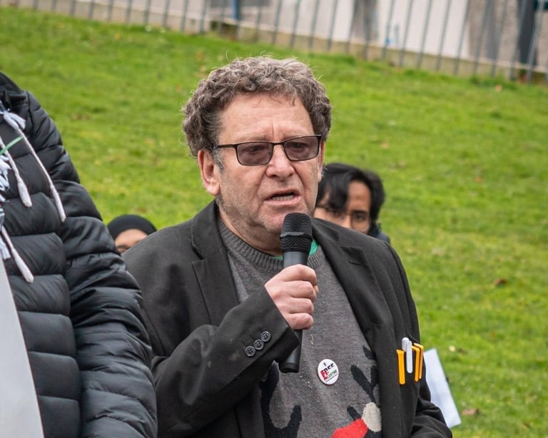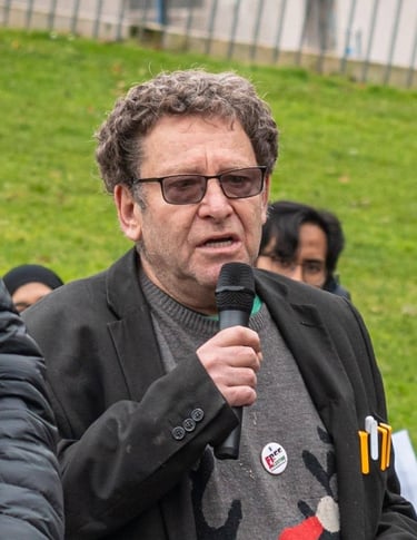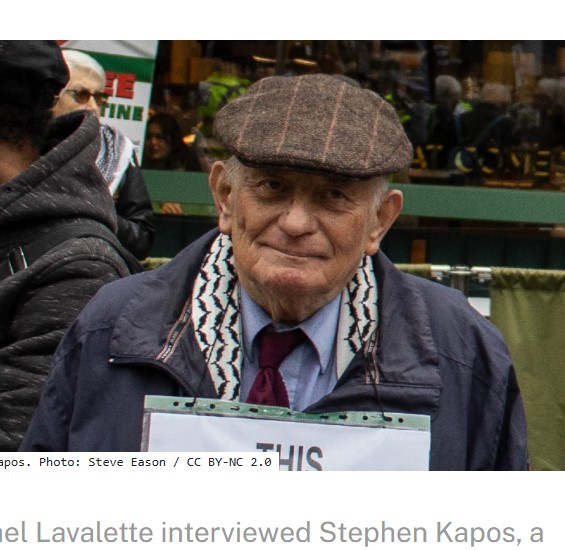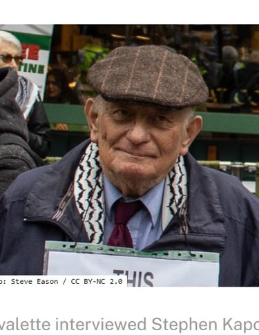 Stephen Kapos – Holocaust-Überlebender: Als kleiner Junge wurde er im kriegszerstörten Budapest von seinen jüdischen Eltern getrennt. Versteckt in Kinderheimen unter falschen Papieren, lebte er in ständiger Gefahr, von ungarischen Faschisten der Pfeilkreuzler-Partei entdeckt zu werden. Stephen ist Aktivist für die Menschenrechte der Palästinenser:innen und aktives Mitglied der Palestine Solidarity Campaign in deren Ortsgruppe Camden. Der Einsatz für Palästinenser:innen, die unter brutaler Besatzung leben, ist ihm besonders wichtig – gerade als Holocaust-Überlebender. "Palästinenser:innen leben unter einem Apartheid-System, wie es von Amnesty International und anderen großen Menschenrechtsorganisationen anerkannt wird."